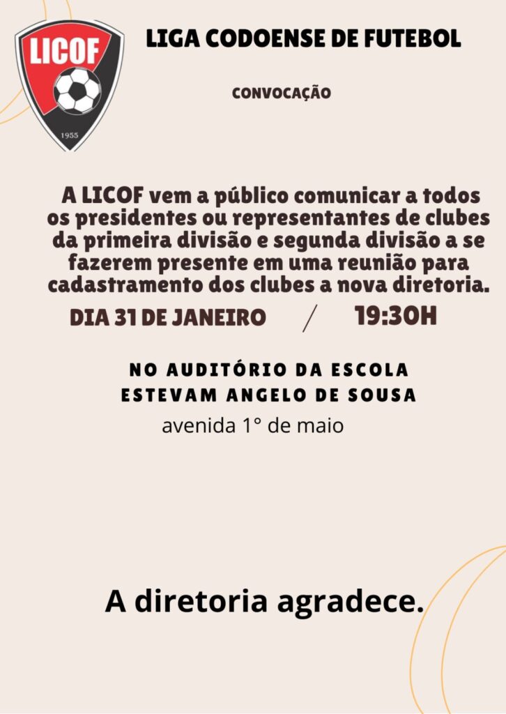 O novo presidente da Liga Codoense de Futebol (LICOF), Akassio Sampaio, eleito para o biênio 2026-2028, convocou todos os representantes de clubes das primeira e segunda divisões para uma reunião estratégica de cadastramento junto à nova diretoria.