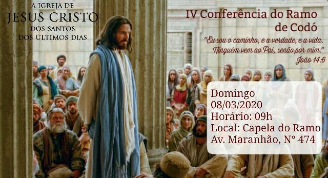 A Igreja de Jesus Cristo dos Santos dos Últimos Dias convida a todos para a 4ª Conferência do Ramo Codó, que será realizada no dia 8 de março, a partir das 9hs, no prédio da Igreja de Jesus Cristo dos Santos dos Últimos Dias, na Avenida Maranhão, 474, próximo ao Mercado Central de Codó.