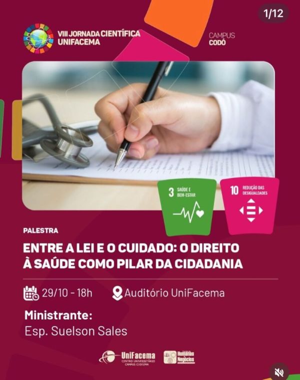 A UniFacema realiza mais uma edição da VIII Jornada Científica, reunindo acadêmicos, profissionais e pesquisadores para discutir temas relevantes nas áreas da saúde, educação e cidadania. Entre os destaques da programação está a palestra “Entre a Lei e o Cuidado: o direito à saúde como pilar da cidadania”, ministrada pelo Esp. Suelson Sales, no dia 29 de outubro, às 18h, no Auditório da UniFacema, Campus Codó.