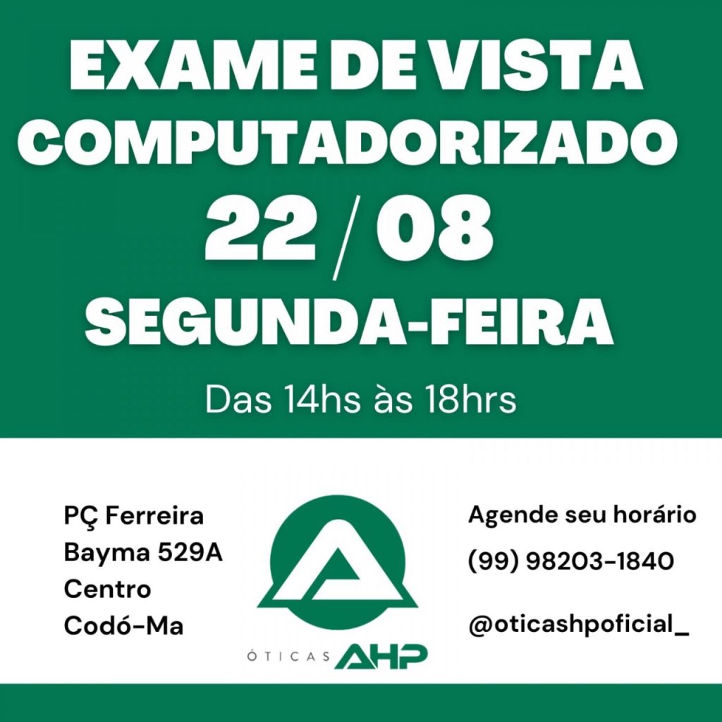 Óticas AHP – Praça Ferreira Bayma 529A Centro, Codó-MA. Telefone (99) 98203-1840.