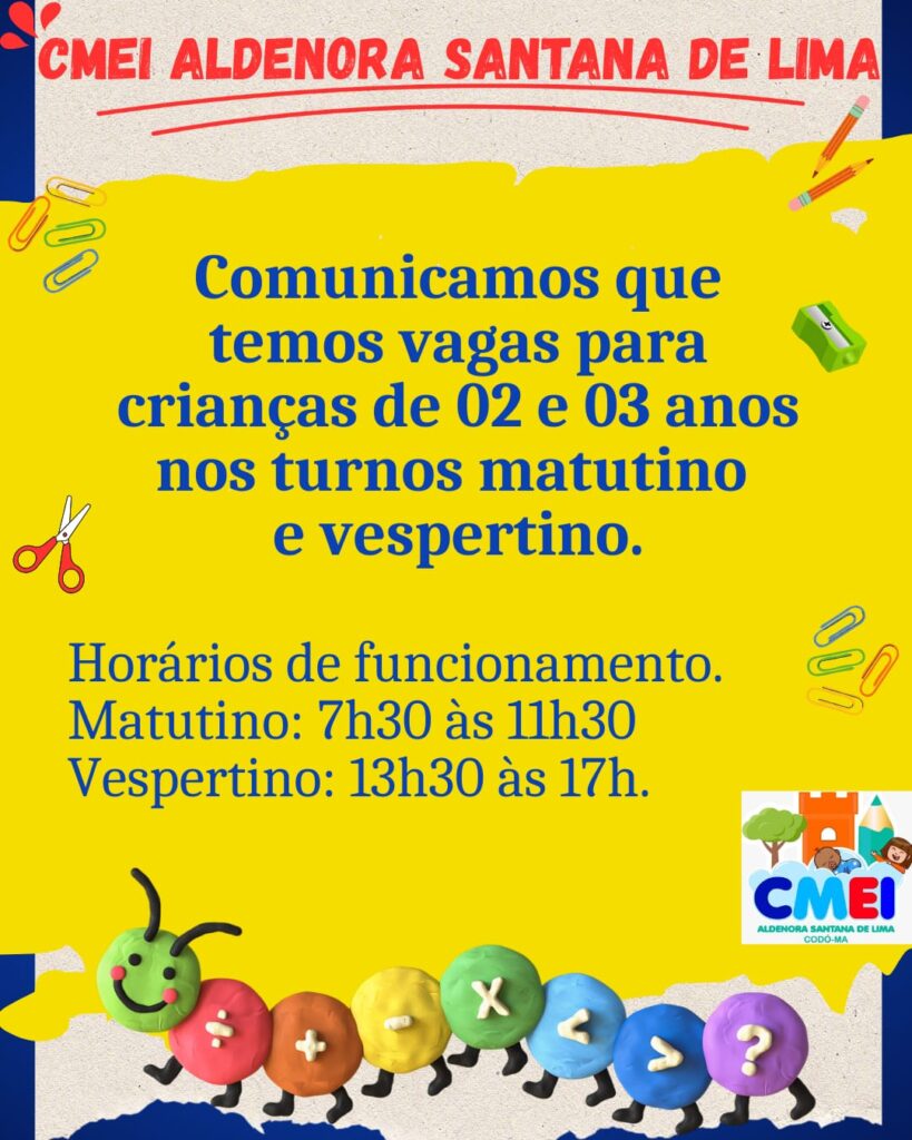 Observação: a família que participou do sorteio online e a sua criança não foi contemplada para o CMEI Aldenora Santana de Lima e tiver interesse em matriculá-la nesse CMEI, para o Maternal 1 e Maternal 2, ainda temos vagas nos turnos matutino e vespertino.