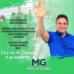 Márcio Gaído, atual vice-prefeito de Aldeias Altas, parabenizou aos estudantes pela passagem de seu dia (11/agosto/2022). Márcio Gaído é evangélico, muito bem relacionado nas igrejas,
