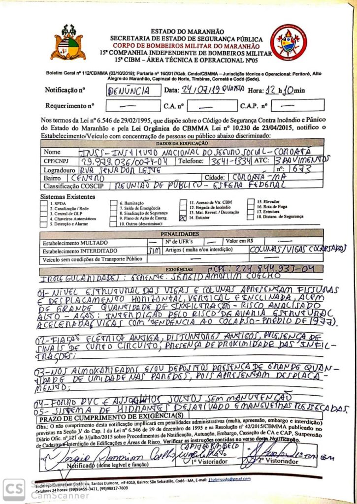 Demanda: Interdição do Prédio INSS Sede Física em Coroatá. Sem Condições Estruturais para Reunião de Público.