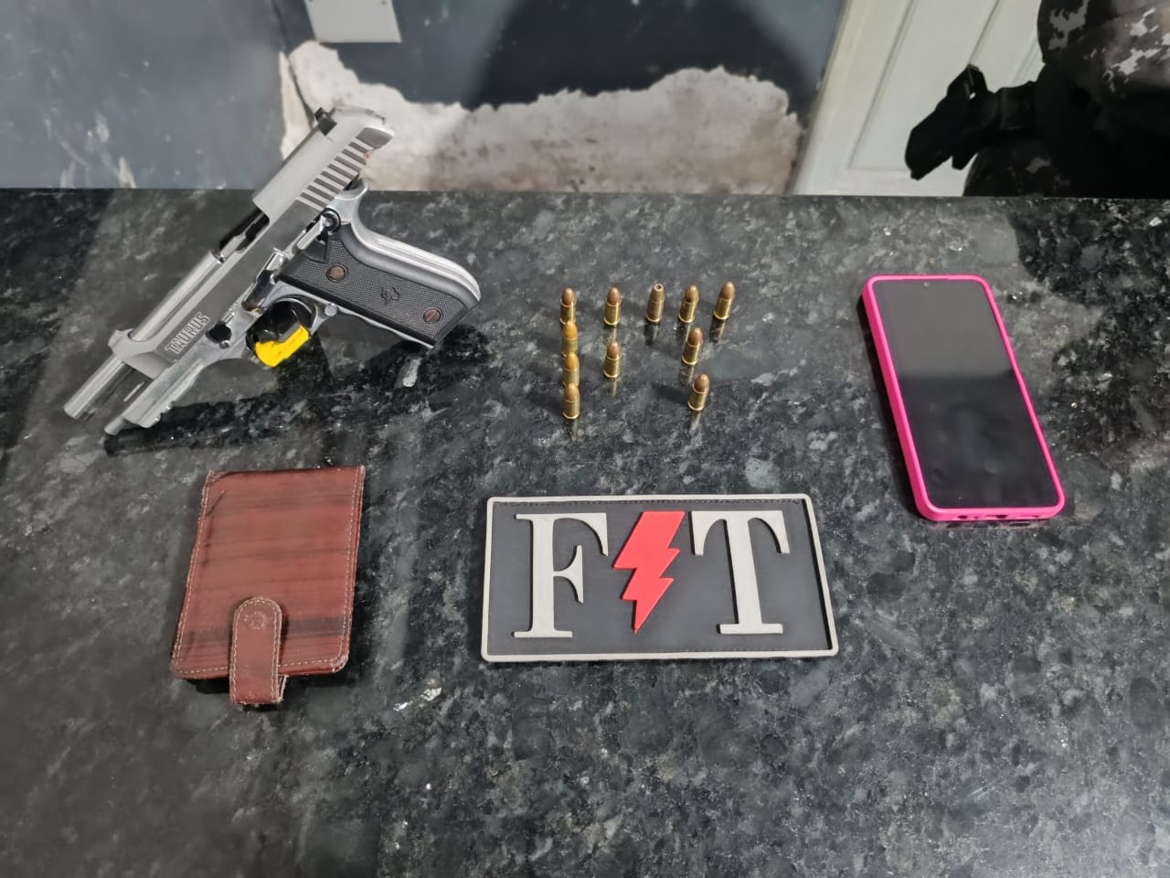 A pistola estava com uma alimentada e carregada. O armamento está com a numeração suprimida.