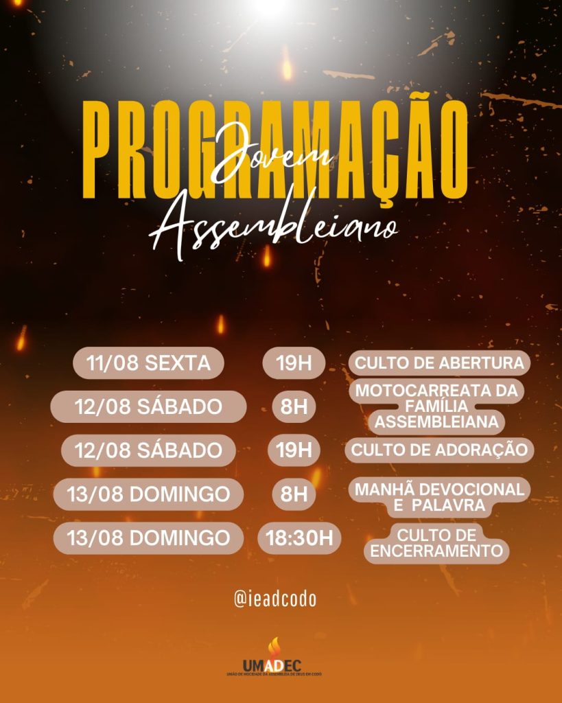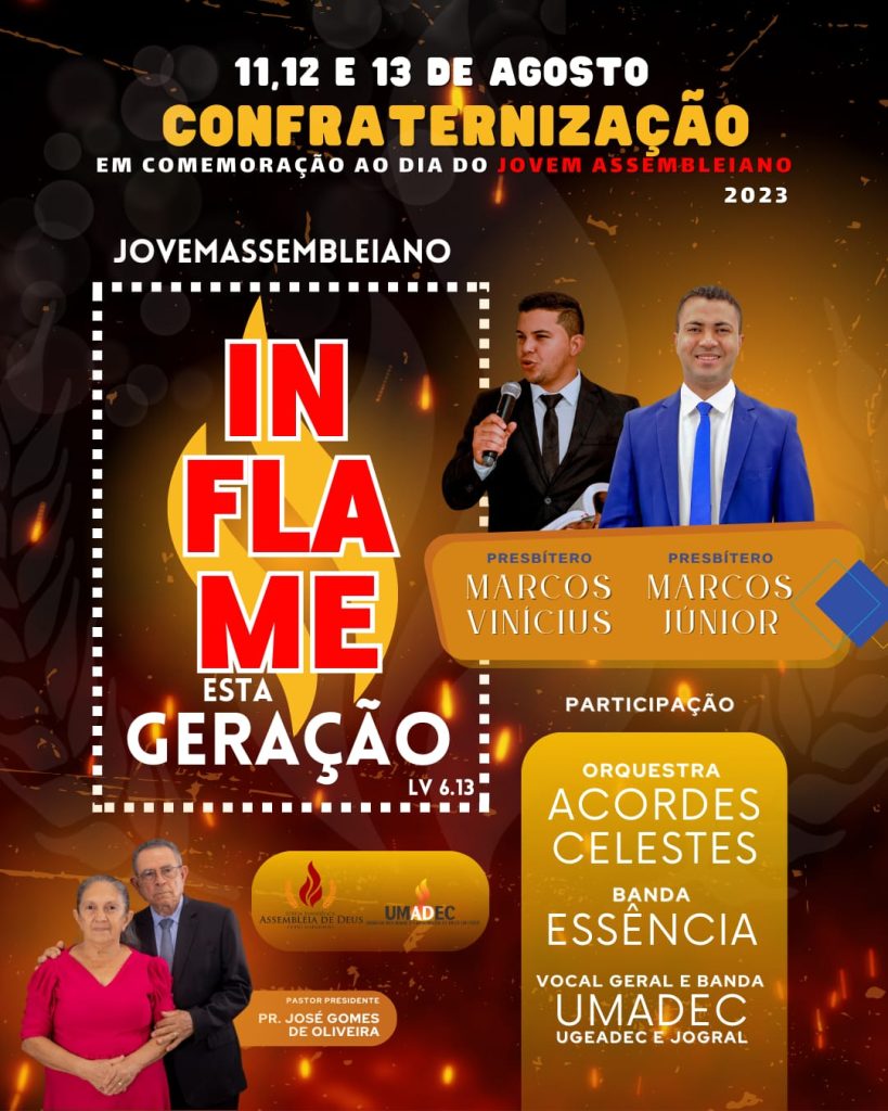 A Igreja Evangélica Assembleia de Deus em Codó-MA, liderada pelo pastor presidente José Gomes de Oliveira, tem a honra de convidar toda a população codoense para participar da grandiosa Festa de Confraternização do Jovem Assembleiano, marcada para os dias 11, 12 e 13 de Agosto de 2023.