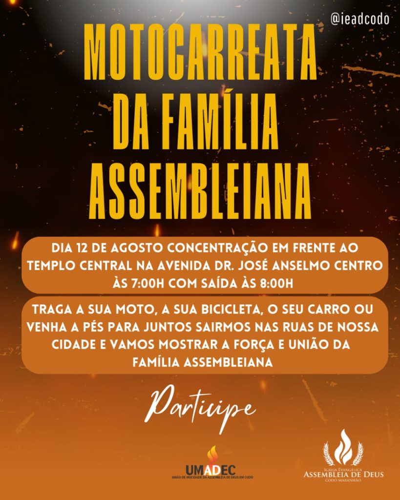 A Igreja Evangélica Assembleia de Deus em Codó-MA convida calorosamente os codoenses e todos os interessados a participar desse evento especial. A presença de caravanas é incentivada, visando criar um ambiente de adoração e compartilhamento espiritual único.
