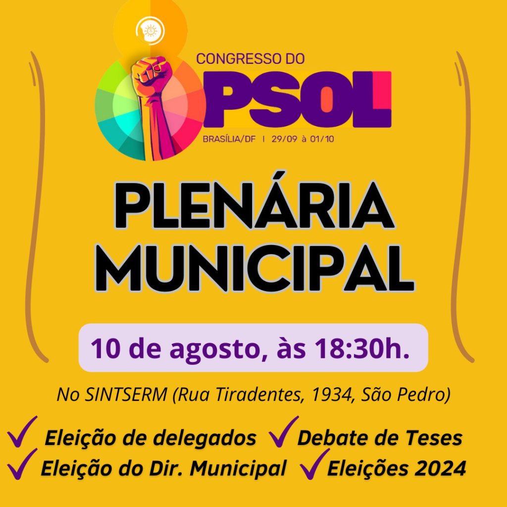 O Diretório Municipal do PSol de Codó realizará na próxima quinta-feira, dia 10, uma Plenária Municipal para debater as teses e eleger delegados para o 8º Congresso Nacional do Partido, que acontecerá em Brasília no período de 29 de setembro a 01 de outubro.