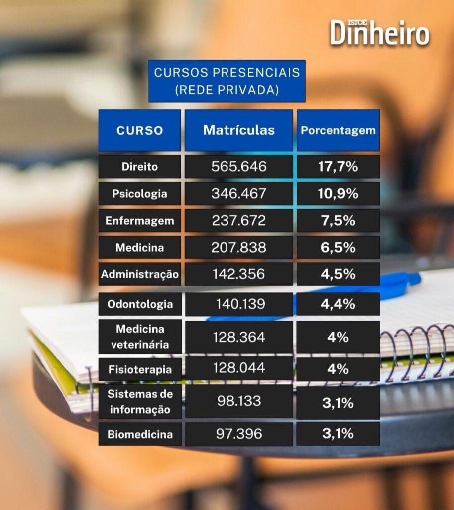 O curso de Direito sozinho contabiliza 565.646 matrículas, representando 17,7% do total de alunos em cursos presenciais da rede.