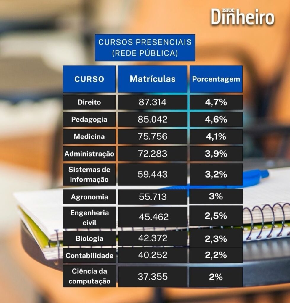 Embora o Direito também lidere na rede pública, a concentração é muito menor: são 87.314 matrículas, o que corresponde a 4,7% do total.
