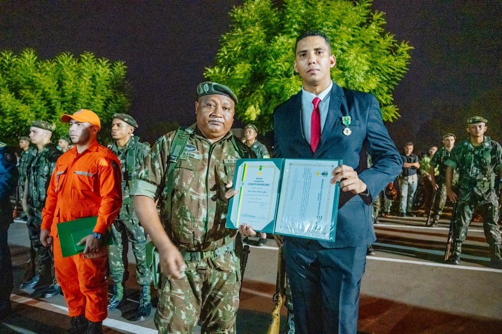 “Hoje, o senhor também faz parte de um grupo seleto, pois irá ostentar no peito a Medalha que se destina a distinguir cidadãos e instituições civis, brasileiras ou estrangeiras, integrantes da Marinha do Brasil, da Força Aérea Brasileira e das Forças Auxiliares que tenham praticado ação destacada ou serviço relevante em prol do interesse e do bom nome do Exército Brasileiro.