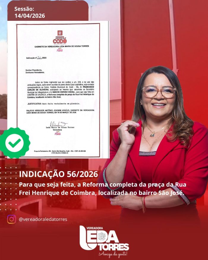 Durante a realização da 9ª Sessão Ordinária da Câmara Municipal de Codó, nesta terça-feira (14), a vereadora Leda Torres apresentou importantes indicações voltadas à melhoria da infraestrutura urbana e da qualidade de vida da população. Entre as proposições aprovadas foi a Indicação Nº 56/2026, que solicita ao Poder Executivo a reforma completa da praça localizada na Rua Frei Henrique de Coimbra, no bairro São José. A iniciativa busca revitalizar o espaço público, oferecendo melhores condições de lazer e convivência para os moradores da região.